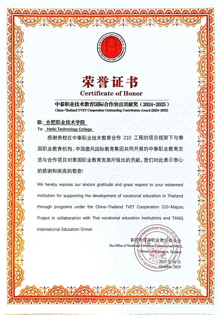 10月29日—11月1日,第26届中国国际教育年会“职业教育赋能国际产教融合分论坛”在北京国家会议中心举行。会上,我校建筑工程学院凭借中泰职业技术教育国际合作“210工程”项目,荣获泰国教育部专业认证、课程认证及中泰职业技术教育国际合作突出贡献奖。
