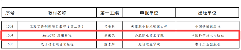 近日,教育部职业教育与成人教育司正式发布《关于公布第二批“十四五”职业教育国家规划教材书目的公告》。由我校机电工程学院焦来荣、胡木林教授担任主编,中国科学技术出版社出版的《AutoCAD应用教程》成功入选,标志着该教材在内容体系、教学适用性和改革创新方面获得国家级认可,正式纳入“十四五”职业教育国家规划教材序列。
